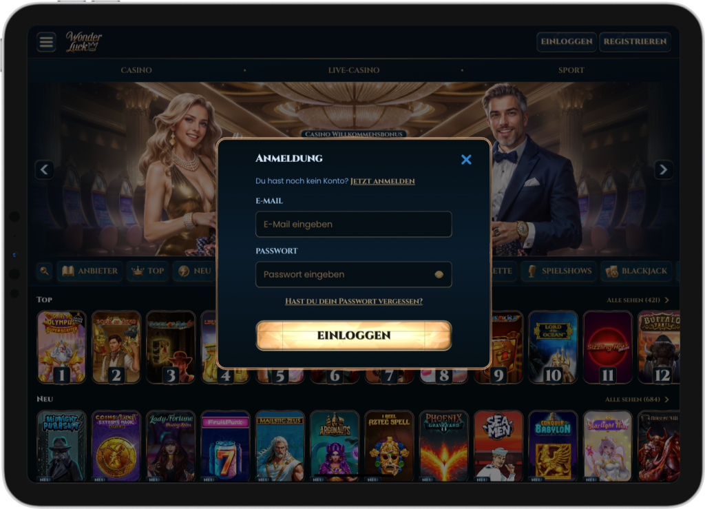 Herzlichen Glückwunsch! Sie haben sich erfolgreich auf unserer Casino Wonder Luck Website registriert. Jetzt ist es an der Zeit, Ihre Lieblingstischspiele zu spielen. Hier kommt der Anmeldeprozess ins Spiel.