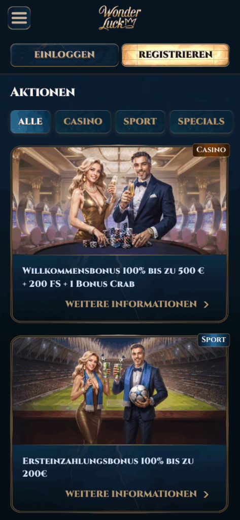 - Werbeaktionen und Boni: Greifen Sie auf Willkommensbonus, Reloads, Cashback-Angebote und laufende VIP-Vorteile direkt über die mobile Schnittstelle zu.