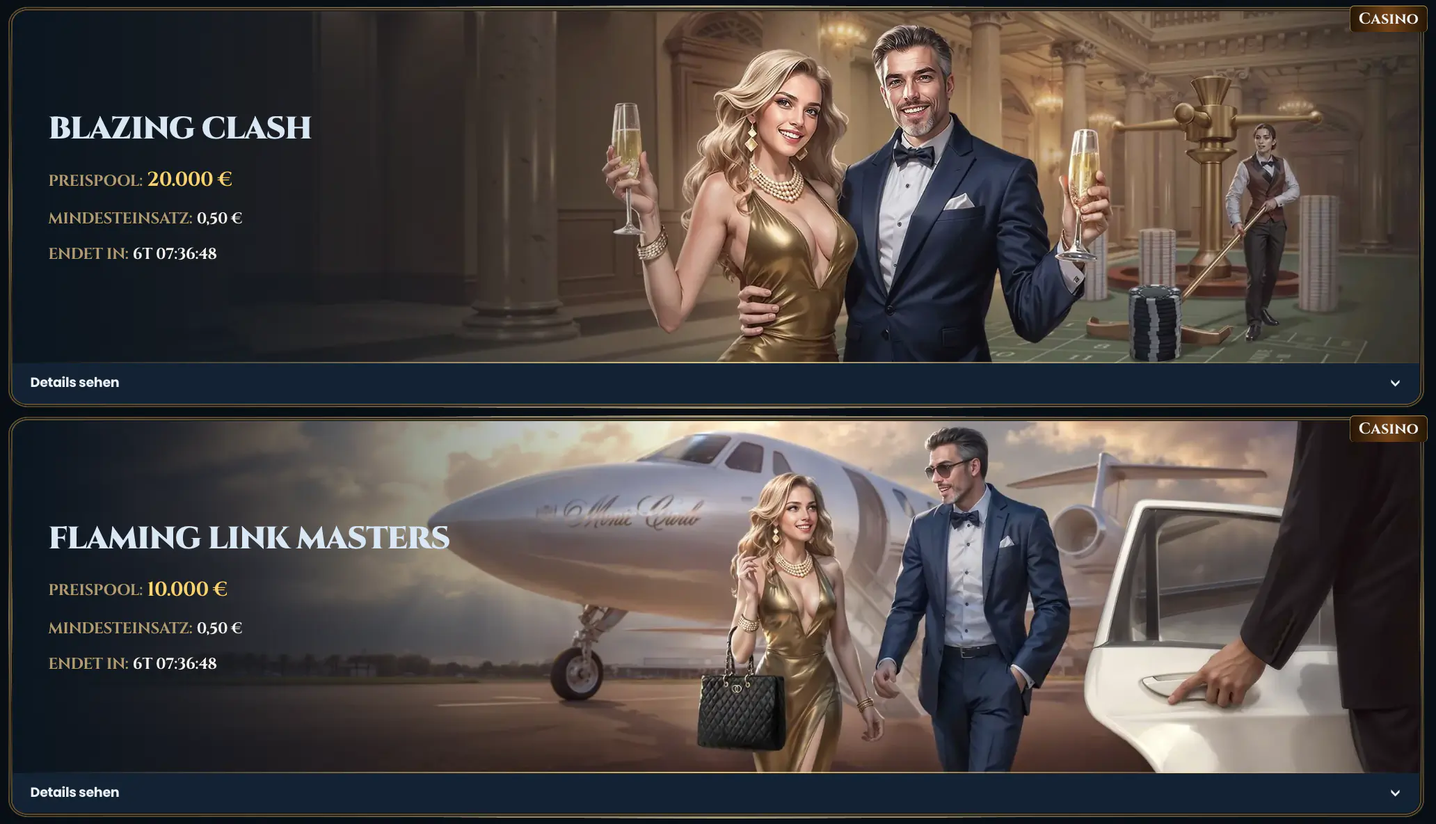 Möchten Sie einen Bonus beanspruchen? Besuchen Sie noch heute unsere Slot-Turniere! Es gibt wettbewerbsfähige Spiele mit Preisen und Casino Freispielen.